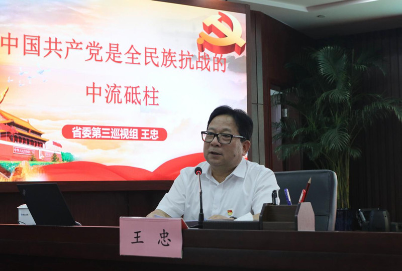 王忠組長以“中國共產黨是全民族抗戰的中流砥柱”為題,從“中國共產黨倡導以國共合作為基礎的抗日民族統一戰線,奠定了奪取抗日戰爭勝利的堅實基礎”、“中國共產黨制定全面抗戰路線和持久抗戰方針,指明了奪取抗日戰爭勝利的根本路徑 ”、“中國共產黨堅持艱苦卓絕的敵后游擊戰爭,發揮了奪取抗日戰爭勝利的戰略作用”、“中國共產黨創建廣大的抗日民主根據地,展現了奪取抗日戰爭勝利的光明前景”等四個方面,全面系統地回顧了中華民族抗日戰爭史,深刻分析了中國共產黨是全民族抗戰中的主心骨、是領導中國人民爭取民族獨立和人民解放的堅強核心、是取得抗日戰爭完全勝利的決定性因素。
