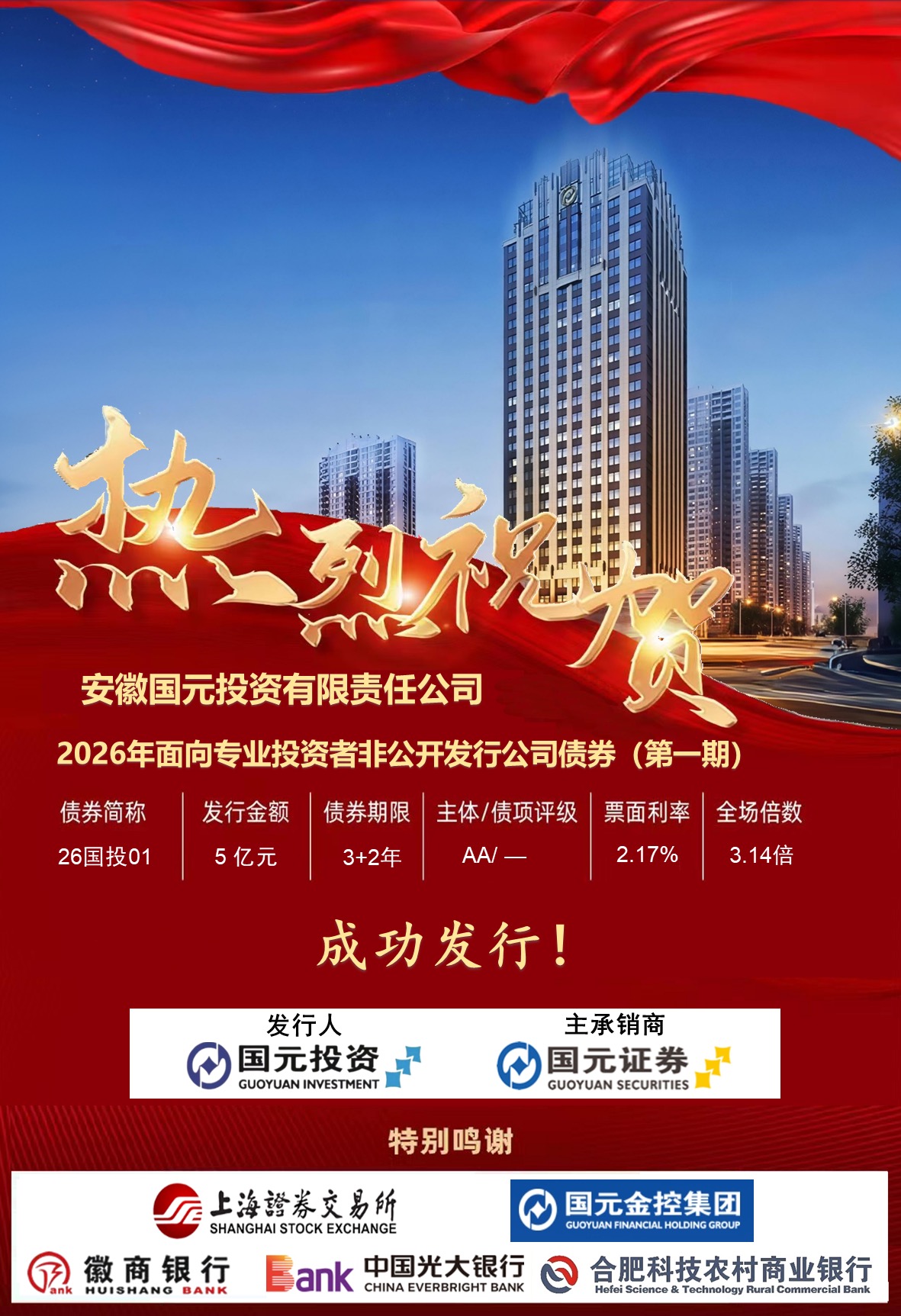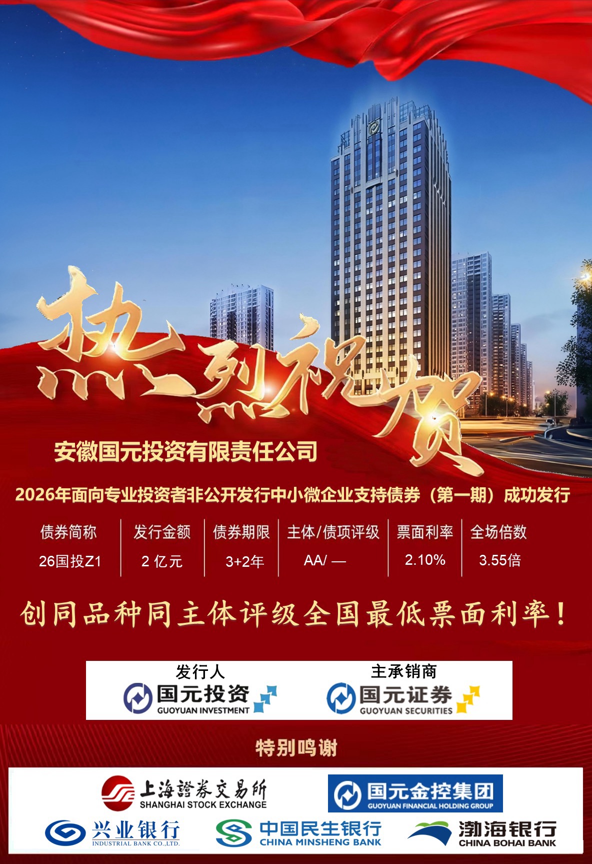 1月29日至30日,國元投資債券發(fā)行工作高效推進(jìn)、捷報頻傳。其中,29日成功簿記的“26國投01”(2026年面向?qū)I(yè)投資者非公開發(fā)行公司債券第一期),發(fā)行規(guī)模5億元,期限3+2年,票面利率2.17%;30日成功發(fā)行的“26國投Z1”(2026年面向?qū)I(yè)投資者非公開發(fā)行中小微企業(yè)支持公司債券第一期),發(fā)行規(guī)模2億元,期限3+2年,票面利率2.10%,創(chuàng)同品種同主體評級全國最低票面利率。兩日累計募集資金7億元,發(fā)行節(jié)奏緊湊、市場反響熱烈,充分彰顯公司在資本市場的卓越信用實力與踐行服務(wù)實體經(jīng)濟(jì)使命的堅定行動力。