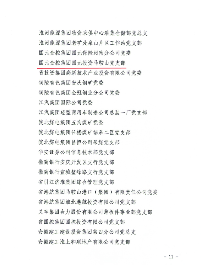 近日,為表彰先進、弘揚正氣,激勵省屬企業(yè)各級黨組織和廣大黨員自信自強、守正創(chuàng)新,踔厲奮發(fā)、勇毅前行,省國資委黨委印發(fā)《省國資委黨委關于表彰省屬企業(yè)優(yōu)秀共產黨員、優(yōu)秀黨務工作者和先進基層黨組織的通報》,國元投資馬鞍山黨支部榮獲“先進基層黨組織”榮譽稱號。