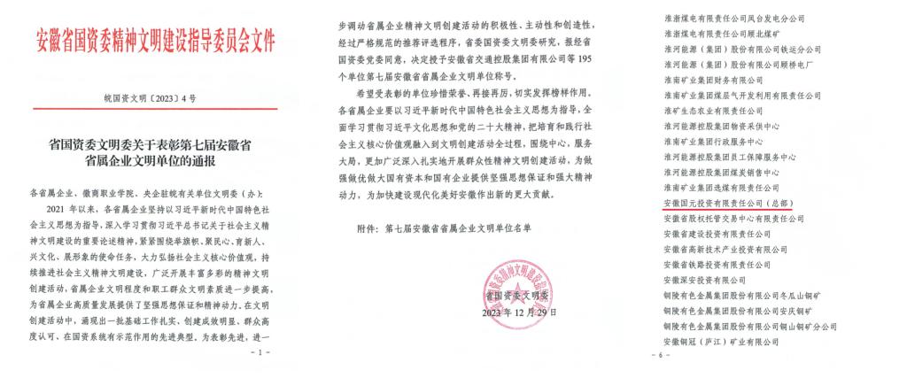 榮獲“安徽省省屬企業文明單位”榮譽,既是對公司精神文明建設的充分肯定,更是對今后創建工作的鞭策激勵。公司將以此次表彰為契機,進一步強化內部管理和業務經營,鞏固精神文明創建成果,實現業務經營和精神文明雙提升、雙豐收,為推動公司高質量發展提供堅強思想保證、強大精神動力。