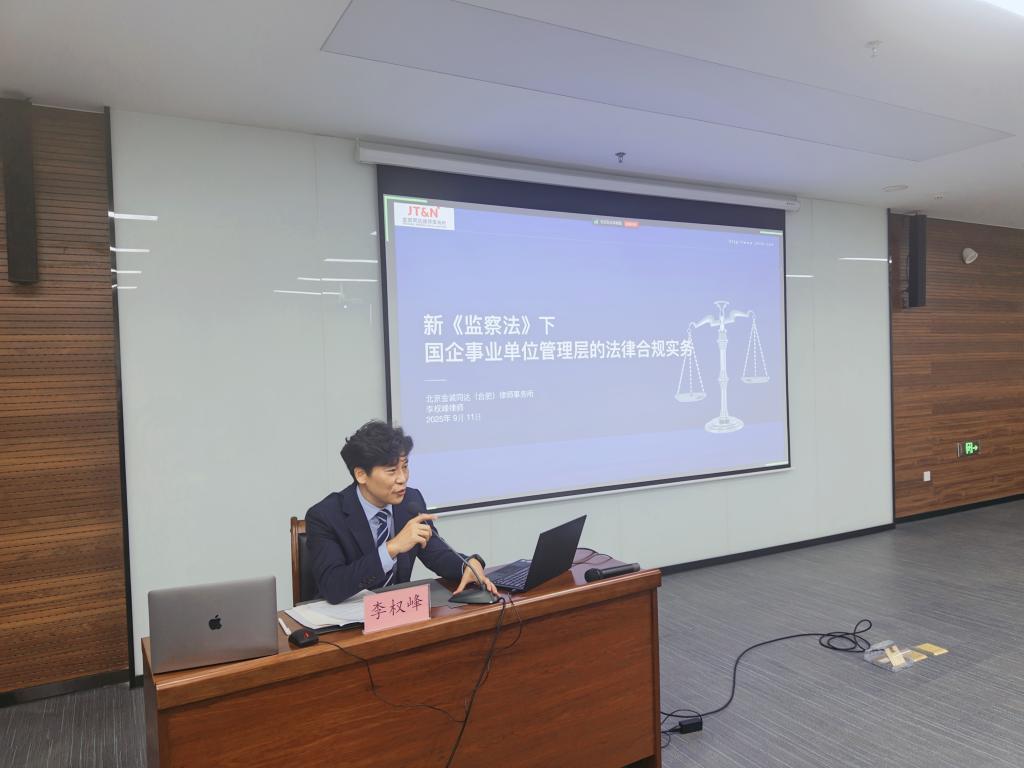 本次培訓采取“線上+線下,專題講座+現場答疑”的形式,邀請北京金誠同達(合肥)律師事務所合伙人李權峰律師為大家講解《中華人民共和國監察法》下國有企業管理人員法律合規實務;風控法務部結合工作實際,圍繞“公司違規經營投資責任追究暫行辦法、投資和貸款評審委員會議事規則、公司治理及三會運轉合規”等主題開展培訓。