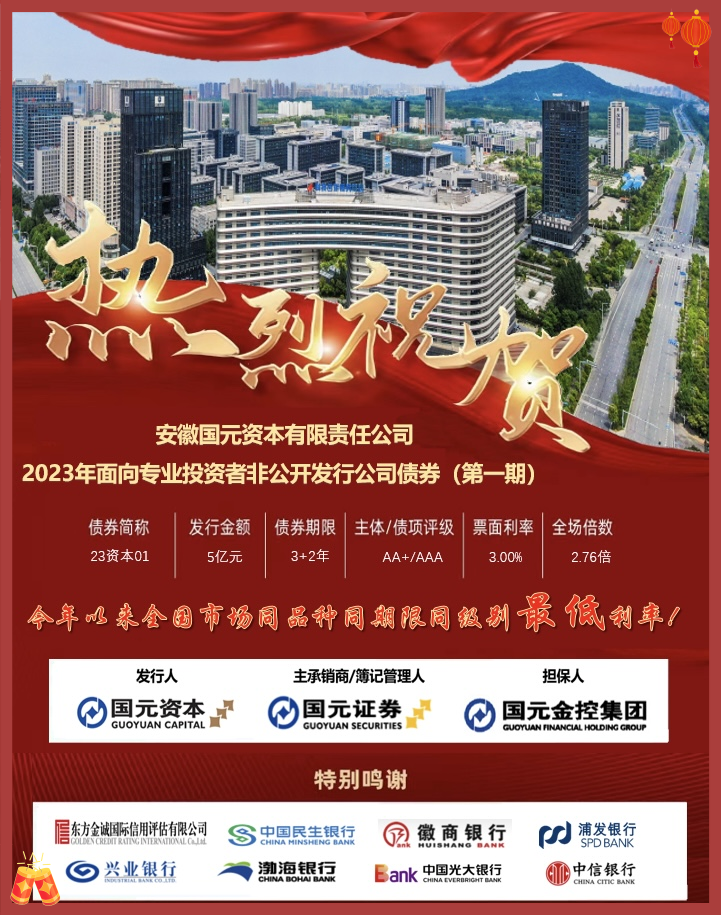 9月26日,國元資本2023年面向專業投資者非公開發行公司債券(第一期)在上海證券交易所成功發行(債券簡稱:23資本01,債券代碼:252619.SH)。本次債券發行主承銷商為國元證券,發行期限3+2年,票面利率3.0%,全場認購倍數2.76倍,創下今年以來全國市場同品種同期限同級別最低利率。