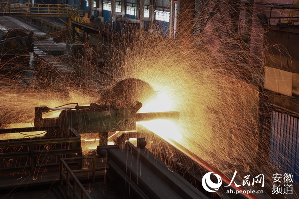 鋼材切割時,四濺的火星猶如一幅畫。圖為馬鋼H型鋼生產線。人民網 王曉飛攝