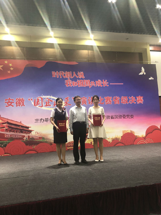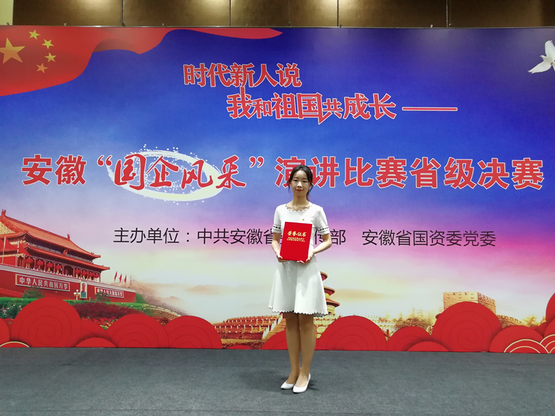 8月1日,省委宣傳部、省國資委黨委組織的“時代新人說——我和祖國共成長”——安徽“國企風采”演講比賽省級決賽在省國資委4樓會議室隆重舉行。此次比賽共有來自省屬企業的23名選手參賽,比賽設一等獎1名,二等獎2名,三等獎3名,優秀獎若干。我司選手黃潔燕在本次比賽中發揮出色,喜獲二等獎。