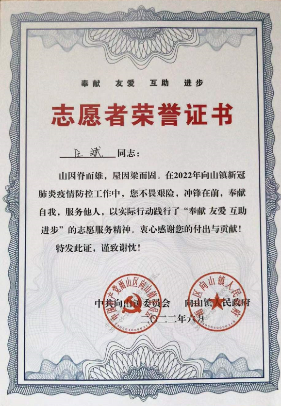 其實這已經不是任斌同志第一次擔任防疫志愿者,早在2020年2月疫情爆發之時,很多人還在居家隔離中,身為退伍軍人的他已經加入社區志愿者隊伍,投身到社區防疫工作中。任斌同志任勞任怨的“實干”精神不僅體現在防疫工作中,在單位本職崗位上也勤勉務實、踏實肯干。每天都是他第一個到公司,在大家上班之前做好衛生清潔工作;工作上的事從不推諉,曾早起開車出差,也曾加班到深夜完成抵押設備的移庫,各項工作任務他都能認真負責的完成。