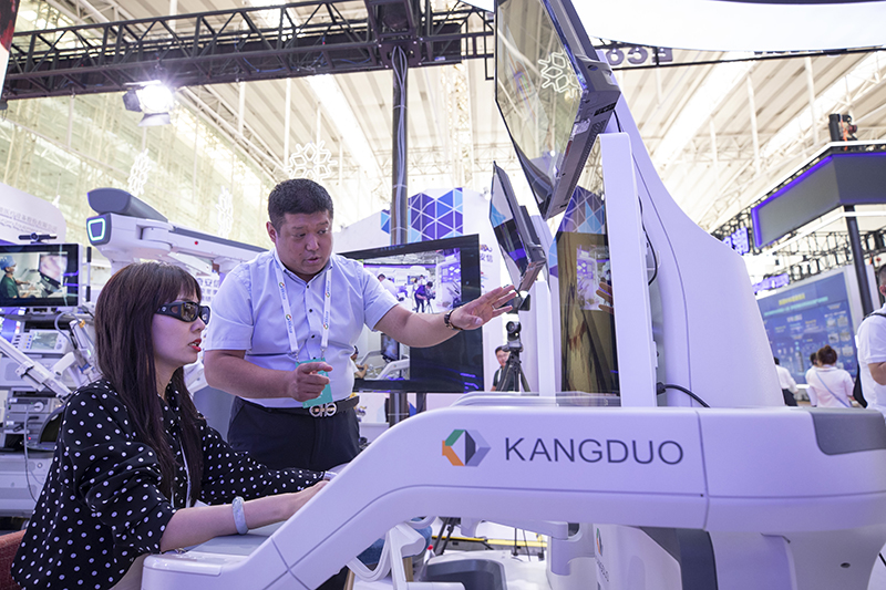 在黑龍江省哈爾濱市舉辦的2022世界5G大會展廳里,參展商現場演示5G遠程手術機器人(2022年8月10日攝)。新華社記者 張濤 攝