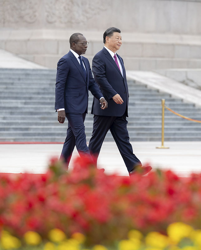 9月1日下午,國(guó)家主席習(xí)近平在北京人民大會(huì)堂同來(lái)華進(jìn)行國(guó)事訪問(wèn)的貝寧總統(tǒng)塔隆舉行會(huì)談。這是會(huì)談前,習(xí)近平在人民大會(huì)堂東門外廣場(chǎng)為塔隆舉行歡迎儀式。新華社記者 丁海濤 攝