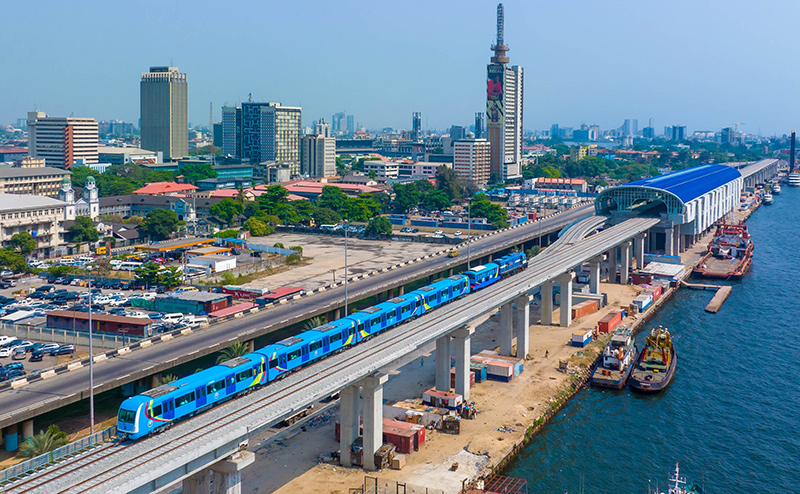 這是尼日利亞拉各斯輕軌藍線上的一列輕軌列車(2022年12月21日攝,無人機照片)。新華社發(托普·阿尤庫?攝)