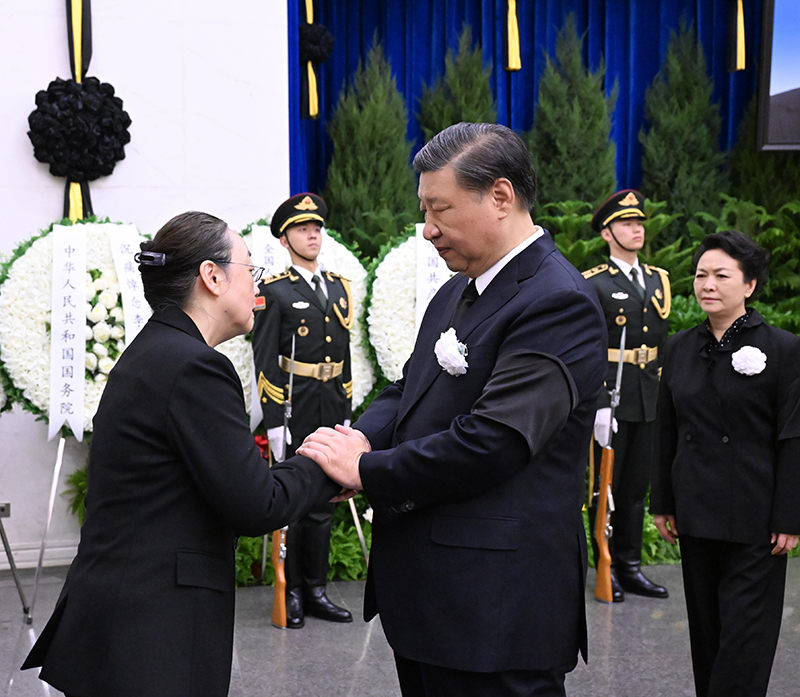 上午9時許,習(xí)近平和夫人彭麗媛,李強、趙樂際、王滬寧、蔡奇、丁薛祥、李希、韓正等,在哀樂聲中緩步來到李克強同志的遺體前肅立默哀,向李克強同志的遺體三鞠躬,并與李克強同志親屬一一握手,表示慰問。胡錦濤送花圈,對李克強同志逝世表示哀悼。