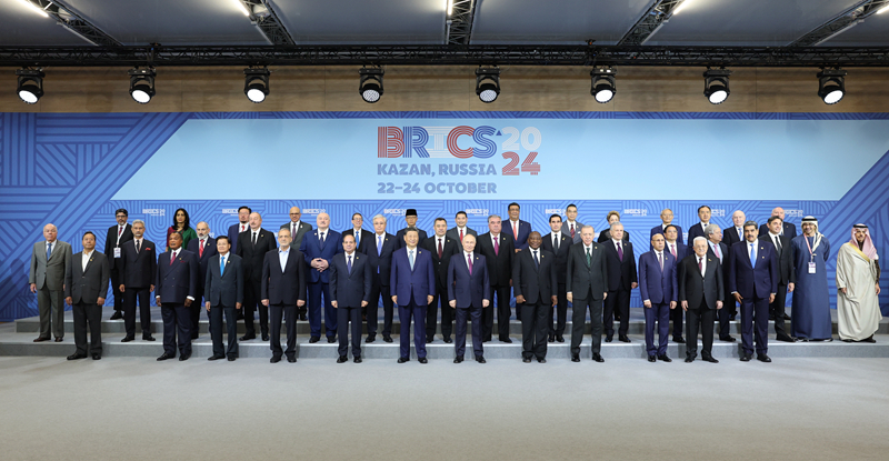 當(dāng)?shù)貢r間10月24日上午,國家主席習(xí)近平在喀山會展中心出席“金磚+”領(lǐng)導(dǎo)人對話會并發(fā)表題為《匯聚“全球南方”磅礴力量 共同推動構(gòu)建人類命運共同體》的重要講話。這是出席對話會的金磚國家及嘉賓國領(lǐng)導(dǎo)人或代表、國際組織負責(zé)人集體合影。新華社記者 姚大偉 攝