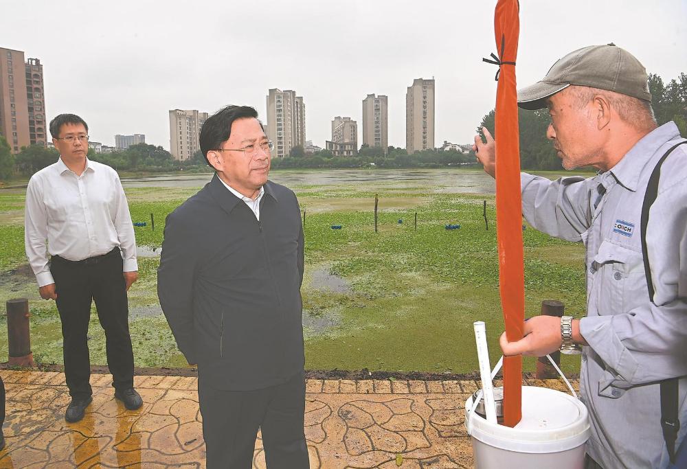 鏡湖區的蓮花湖水域面積86.7公頃,與小區居民樓最近距離不足20米。2022年以來,水質明顯惡化,湖中長滿浮萍和水草,水體渾濁,異味明顯,周邊群眾反映強烈。韓俊來到湖邊,冒雨沿著濕滑的小路走近勘查,并現場讓環保工作人員檢測水質。得知水體被嚴重污染,已成為黑臭水體時,韓俊表情嚴肅地說,要盡快查明原因,科學制定方案,強化源頭治理、綜合治理,扎實做好截污清淤、雨污分流、生態修復和日常管理等工作,早日還群眾一湖清水。看到有群眾路過,韓俊主動上前詢問“過去水質怎么樣”“水體是怎么被污染的”,認真聽取他們的意見建議。他指出,“民有所呼,我必呼應”。對蓮花湖水體污染,群眾意見大,但政府反應慢,重視不夠,說明工作不到位,要認真反思。他要求有關部門掛牌督辦,堅決把受污染的水體治理好。韓俊強調,要建立健全突出生態環境問題整改領導包保責任制,壓實企業主體責任,以責任過硬、措施過硬、作風過硬解決生態環境領域頑瘴痼疾,不斷增強人民群眾的獲得感幸福感安全感。