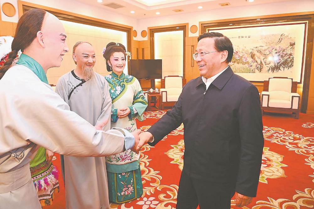 韓俊強調(diào),安徽歷史文化底蘊厚重,是中華優(yōu)秀傳統(tǒng)文化活的博物館。要深入學(xué)習(xí)貫徹習(xí)近平文化思想,堅定文化自信,秉持開放包容,堅持守正創(chuàng)新,傳承好、保護好、發(fā)揚好徽劇、黃梅戲、廬劇等安徽優(yōu)秀劇種,推動優(yōu)秀傳統(tǒng)文化創(chuàng)造性轉(zhuǎn)化和創(chuàng)新性發(fā)展。要堅持向上向善,大力弘揚社會主義核心價值觀,把藝術(shù)創(chuàng)作融入時代、融入生活、融入群眾,推出更多有思想、有溫度、有品質(zhì)的好作品,形成不斷出精品、出人才的生動局面。要強化文藝擔(dān)當(dāng),把安徽優(yōu)秀傳統(tǒng)文化的精神內(nèi)核和時代價值提煉出來、展示出來,進一步擴大優(yōu)質(zhì)文化供給,推動安徽文化走出去,讓更多人感受到徽風(fēng)皖韻的獨特魅力,加快建設(shè)繁榮興盛的文化強省。