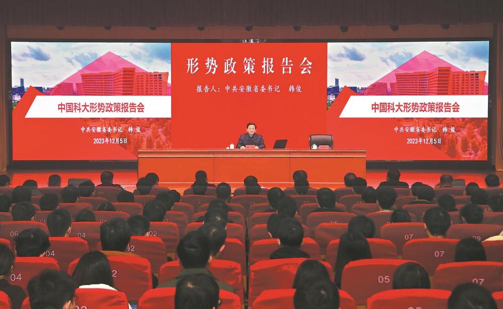 12月5日,省委書記韓俊在中國科學技術大學作形勢政策報告。(記者 楊竹 攝)
